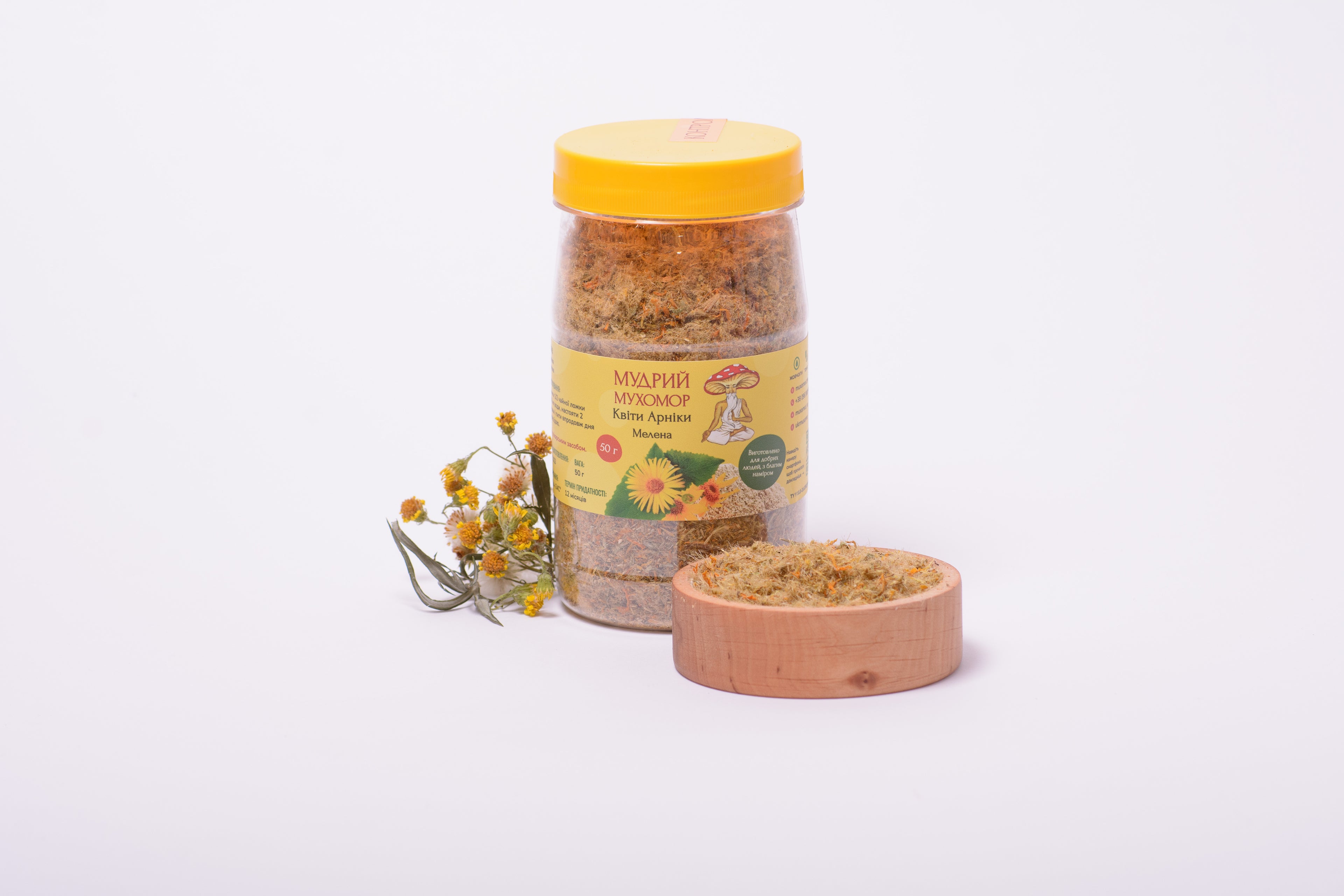Мелені суцвіття від «Мудрого мухомора» найкраще використовувати внутрішньо. Для цього 1 г меленої суміші Арніки заливають 200 мл окропу, настоюють 2 години та п’ють перед їдою протягом дня.