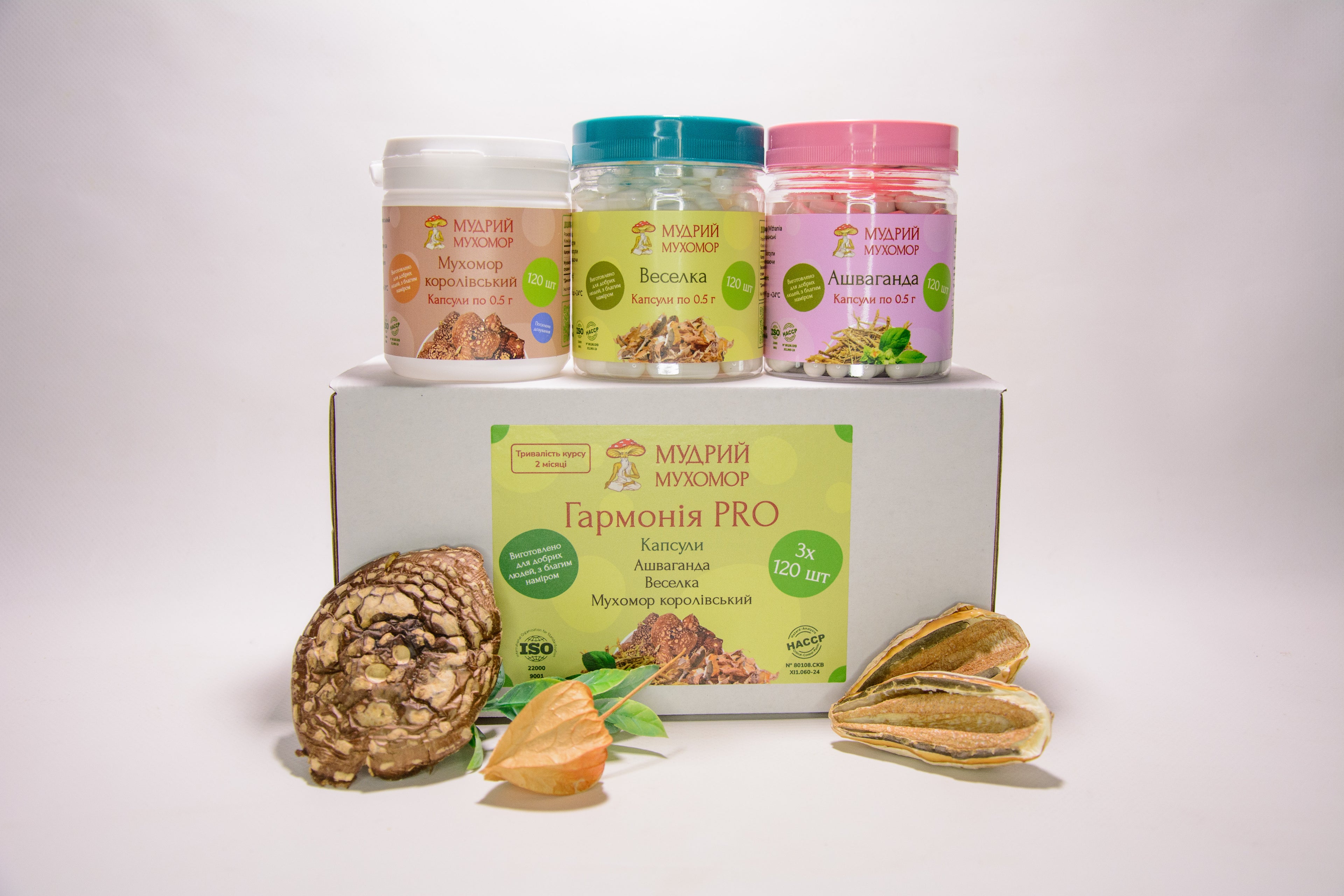 4. Гармонія PRO. В цьому наборі ми вперше бачимо не тільки гриби, але й рослину. Курс створено з метою забезпечення високого рівня та стабільності лібідо, він може вчасно підтримати правильний гормональний баланс.