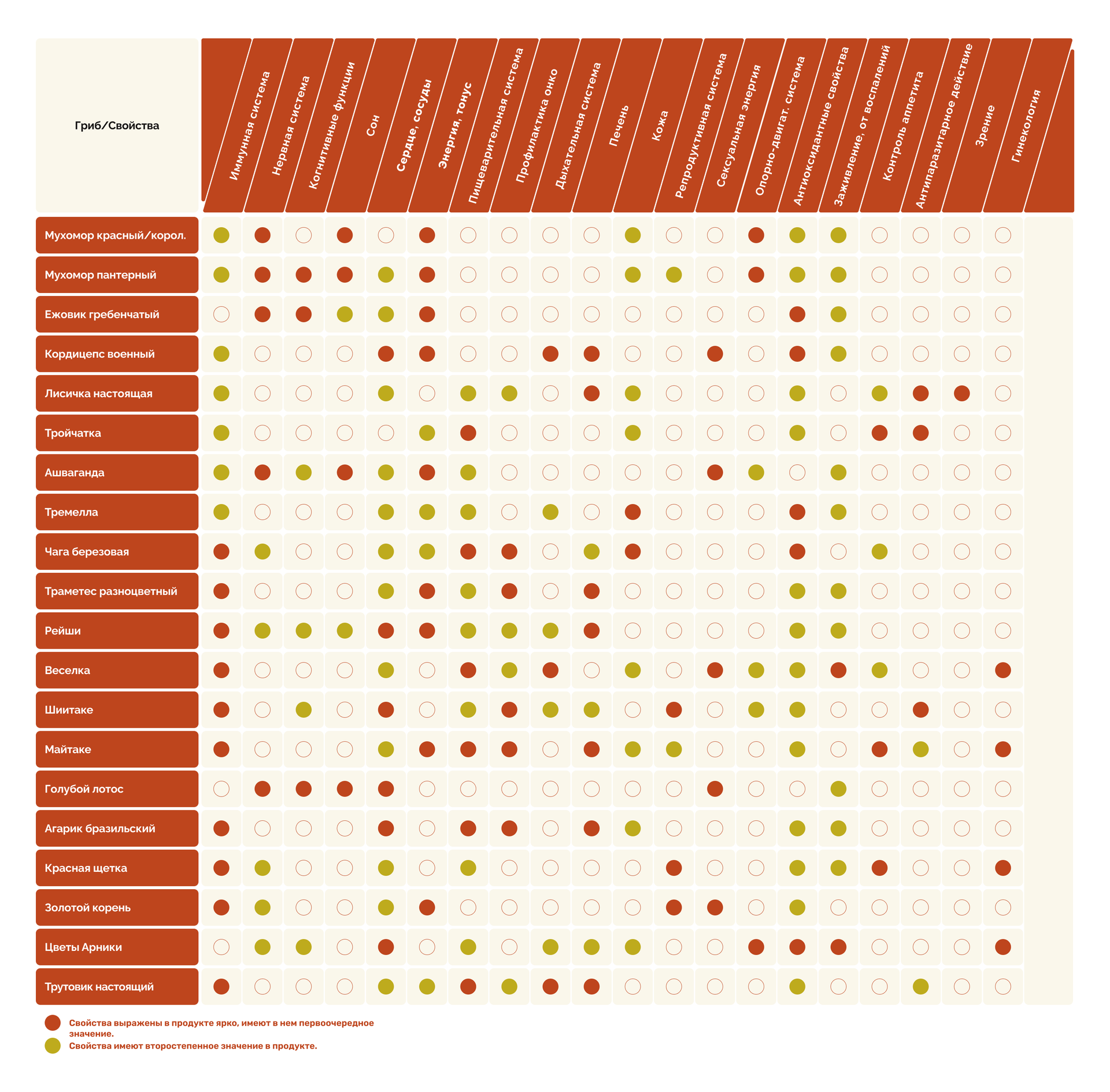 Каждая из них соответствует определенному грибу – именно тот гриб, который лучше справится с поставленной задачей. Выбирай добавки с соответствующими грибами – и получишь максимальную пользу